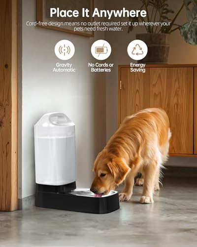 【No Power, No Bills – Gravity-Powered Convenience】This gravity-fed large dog water bowl dispenser works without electricity, batteries, or cords – just fill and place it anywhere your pet needs hydration. Perfect for homes with limited outlets, RVs, patios, or travel. The cordless design eliminates placement restrictions and allows you to set it up wherever your dog prefers to drink. No more fighting for socket space or worrying about cords.