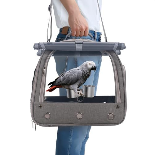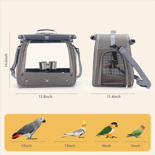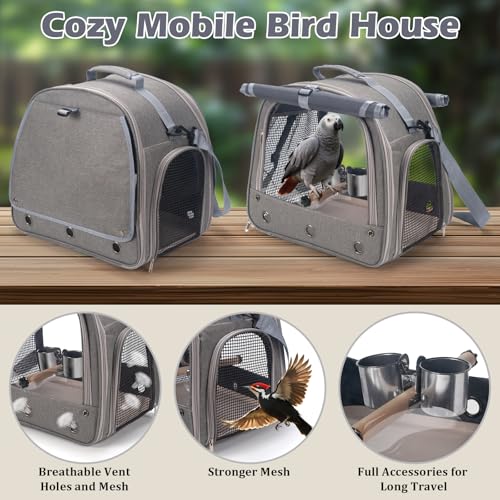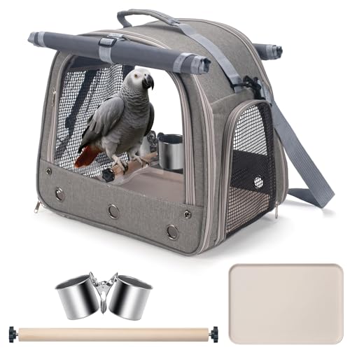 Bird Carrier Parrot Travel Cage with Perch, Food Bowl, Tray and Breathable Clear Window, Bird Travel Bag for African Gray Cockatiel Caique Conure Quaker, for Vetting Camping Hiking (Gray)
