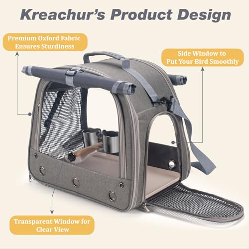 BREATHABLE DESIGN: With large and more vent holes and mesh, Kreachur Pet Carrier Flight Cage provides optimal ventilation and airflow to your parrot. Front transparent window allows great scenery view while travel.