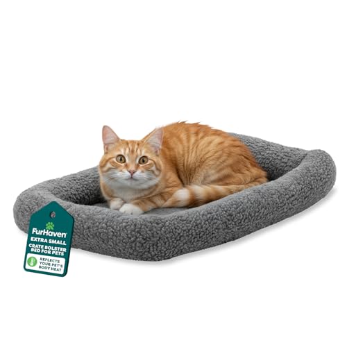 FurHaven Dog Bed for Extra Small Dogs & Cats, Bolster Crate Pad with Soft Supportive Base for Carriers & Kennels, Machine Washable, Extra Small, Sherpa Fleece, Gray
