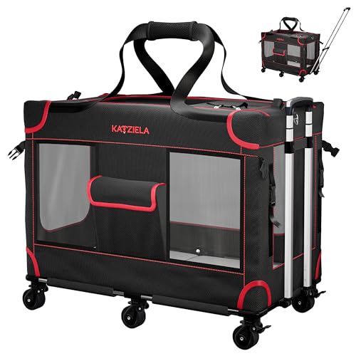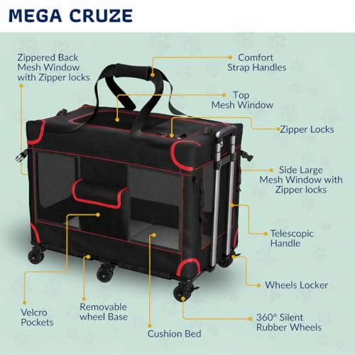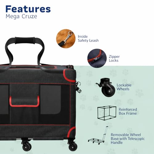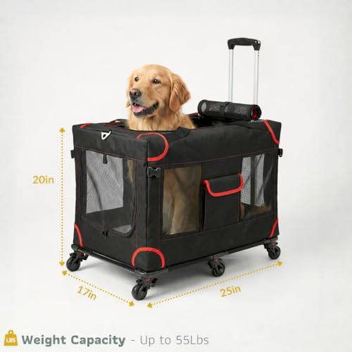MegaCruze Rolling Pet Carrier for Medium & Large Dogs 25”x17”x20”. Lockable Wheels Zipper Locks Telescopic Handle Breathable Mesh, Removable Wheel Base, Stress-Free Travel Outdoor and Indoor