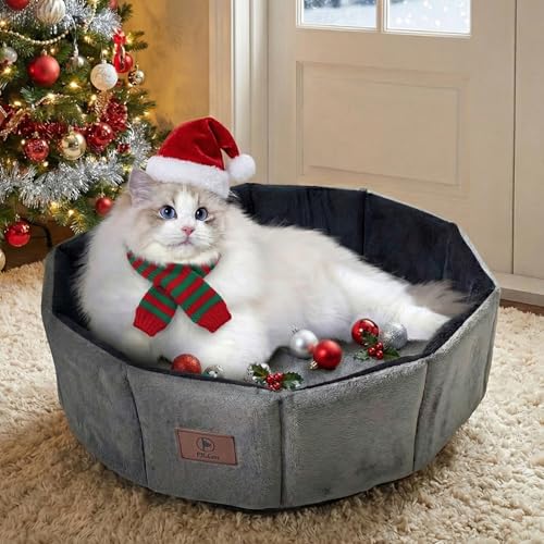 PJYuCien Large Cat Bed, Washable 20 inch Round Kitten Bed for 2 Cats Indoor Up to 18 lbs, Anti-Slip and Super Soft Durable Fabric Pet Beds, Fluffy Inner Mat for Kitten and Small Dogs (Gray)